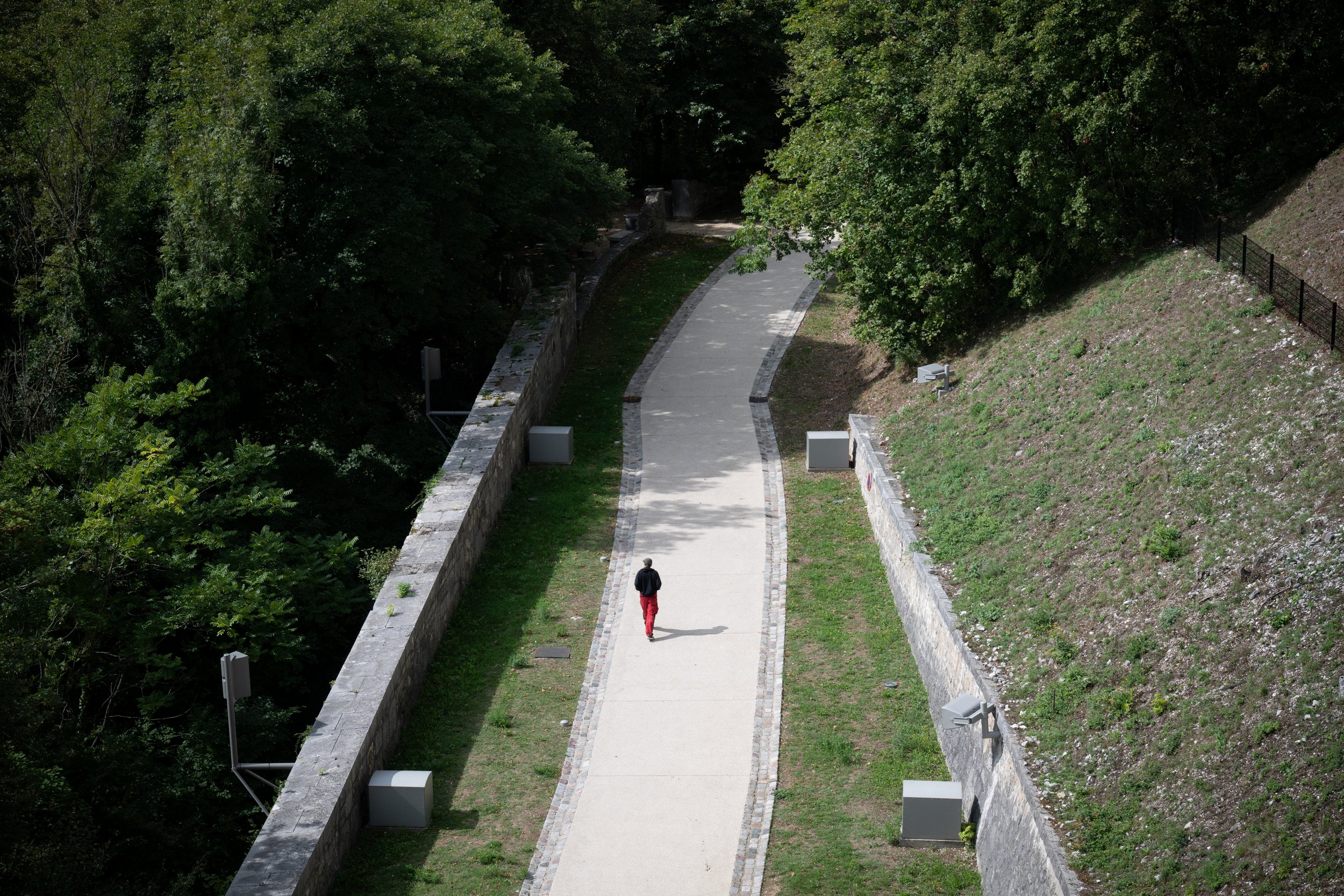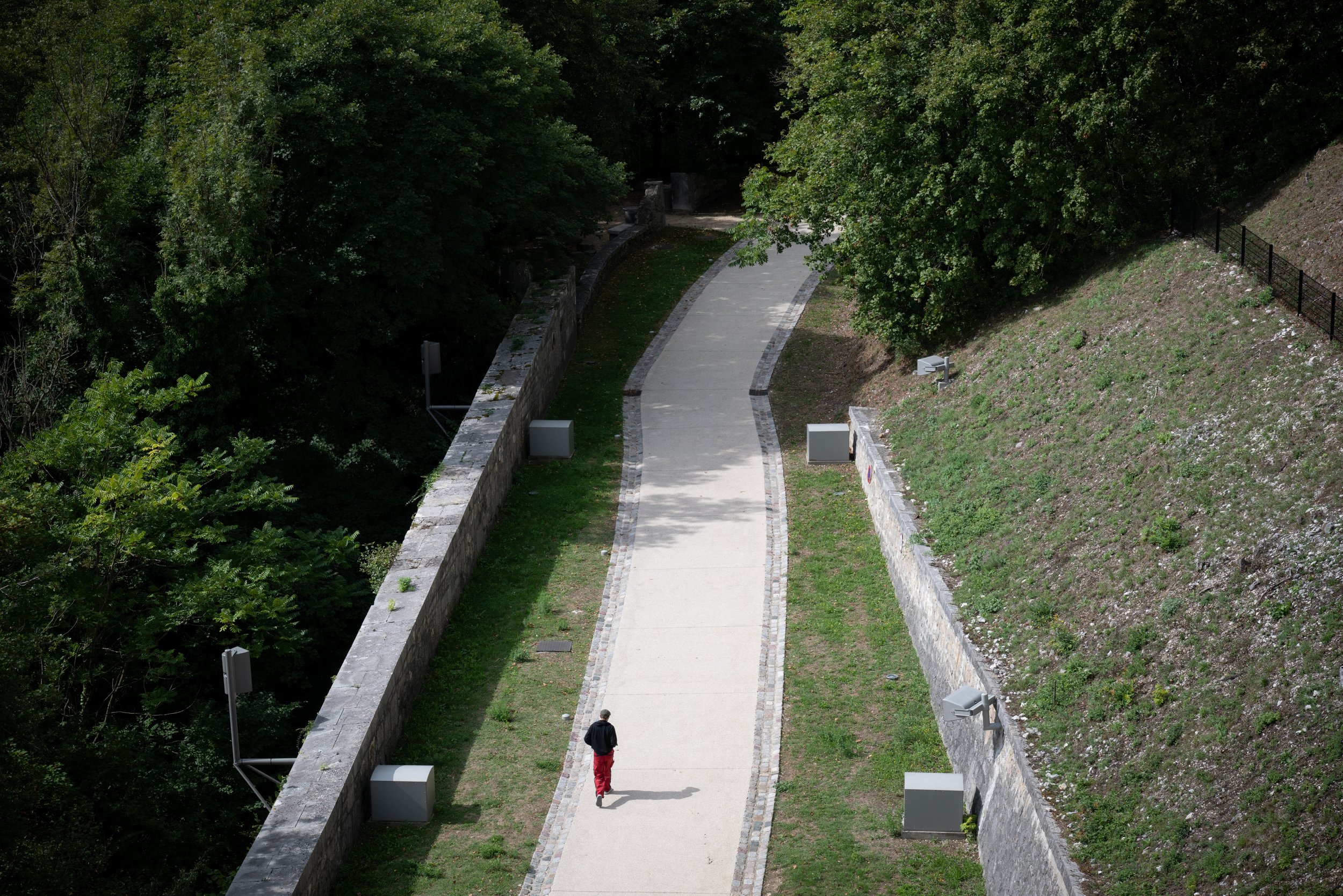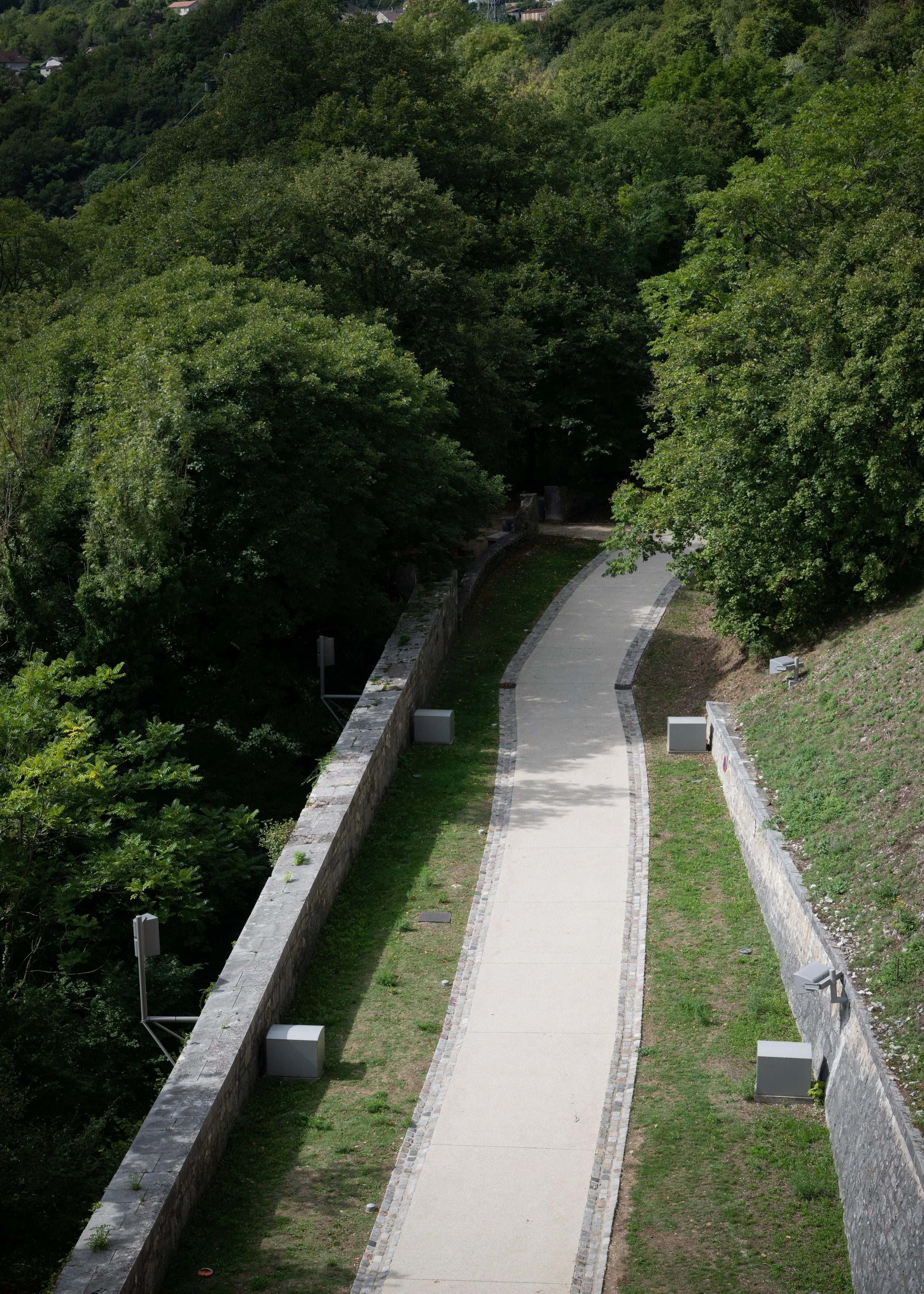 Six haut-parleurs et quatre caissons de basse, volumineux et disposés de part et d’autre du chemin, diffusent en boucle une longue suite de séquences parlées et musicales. Les cordes vocales convoquent un collectif de voix, de différents âges et genres, de paroles brèves, retenues puis légèrement développées ; des mini-récits émergent parfois, portés par quelques éléments musicaux. Les voix composent un seuil, un sas, elles nous accueillent, puis nous partons avec elles en sortant du fort.